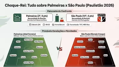 Neste sábado (24), às 18h30, Palmeiras e São Paulo se enfrentam pela 5ª rodada do Paulistão, na Arena Barueri. Após derrotas recentes — Palmeiras goleado por 4 a 0 pelo Novorizontino e São Paulo batido pela Portuguesa por 3 a 2 — os dois times chegam pressionados e com necessidade de reação imediata.