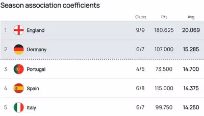 Germany sits in second place and could clinch a fifth Champions League slot depending on deeper runs by clubs like Bayern Munich. Spain, Italy and Portugal remain close enough to mount a challenge, while France’s position could hinge on standout campaigns from Lyon and Strasbourg in the Europa League and Conference League respectively. PSG also remain a potential decider-maker in the Champions League.
