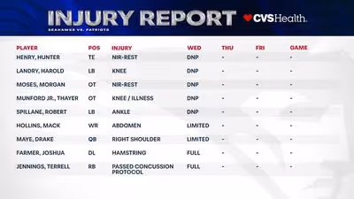 Patriots’ estimated Wednesday injury report listed Drake Maye as limited with a right-shoulder issue; with no practice held the listing is speculative. Betting impact: expect caution on Maye passing props and MVP wagers and potentially tighter Super Bowl lines — bettors should wait for official practice and gameday designations before placing significant bets.